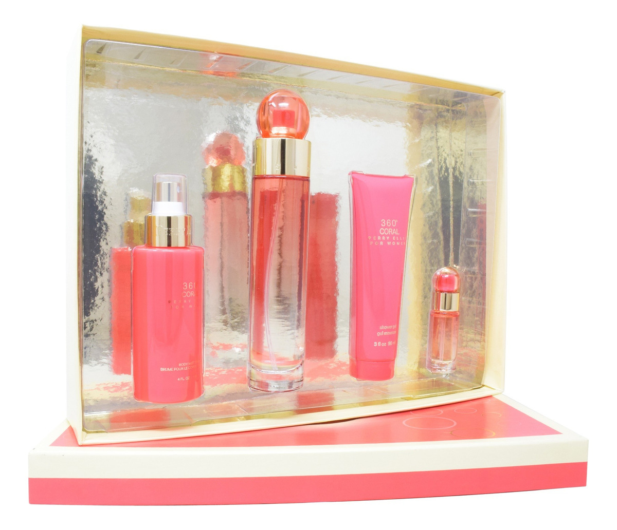 Perry Ellis Set 360 Coral For Women 118ml Eau de Parfum Para Mujer. Set 360 Coral For Women Perry Ellis; 4 Piezas; Loción Edp 100 Ml; Body Mist 118 Ml; Shower Gel 90 Ml & Loción Edp 7.5 Ml. Las Notas de Salida son bergamota, manzana, pera, pimienta rosa y durazno (melocotón); las Notas de Corazón son jazmín, peonía y lirio de los valles (muguete); las Notas de Fondo son madera de cachemira, ámbar, haba tonka y almizcle. Una fragancia puede seducir, traer lindos recuerdos o hacerte soñar con un lugar lejano. Inspiradas en el arte, la poesía y la cultura, nuestras finas fragancias se mezclan utilizando los mejores aceites esenciales y absolutos del mundo.