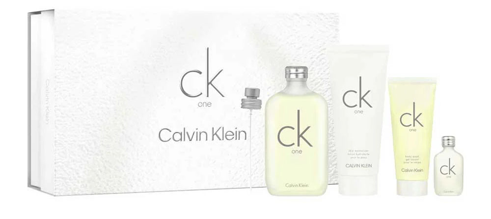 Incluye: Eau de Toilette 200 ml Eau de Toilette 15 ml Hidratante corporal 200ml Jabón líquido para el cuerpo 100ml CK One de Calvin Klein es una fragancia de la familia olfativa Cítrica Aromática para Hombres y Mujeres. CK One se lanzó en 1994. CK One fue creada por Alberto Morillas y Harry Fremont. Las Notas de Salida son limón (lima ácida), notas verdes, bergamota, piña, mandarina, cardamomo y papaya; las Notas de Corazón son lirio de los valles (muguete), jazmín, violeta, nuez moscada, rosa, raíz de lirio y fresia; las Notas de Fondo son acordes verdes, almizcle, cedro, sándalo, musgo de roble, ámbar y té verde.