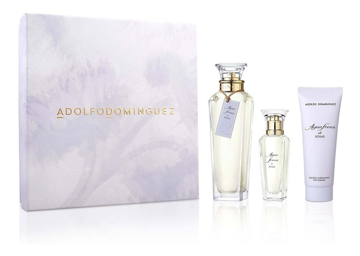 Agua Fresca de Rosas Familia olfativa: Chipre Floral Origen: Hecho en España El set incluye: 1 Eau de Toilette Spray 120 ml 1 Eau de Toilette Spray 30 ml 1 Loción Corporal Hidratante 75 ml Notas de Salida: toronja (pomelo), bergamota y mandarina. Notas de Corazón: rosa, lirio de los valles (muguete), azucena y jazmín. Notas de Fondo: sándalo, almizcle, musgo y ámbar.