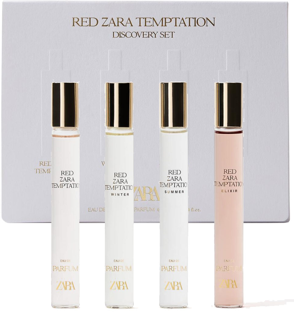 Eau de parfum. Descubre el encanto de la colección Red Temptation de Zara con nuestro exclusivo set de descubrimiento de perfumes. Este conjunto cuidadosamente seleccionado está diseñado para encantar tus sentidos y elevar tu guardarropa de fragancias a través de las estaciones. Cada juego incluye cuatro fragancias distintas de 10 ml, que encapsulan la esencia de Red Temptation en su forma original, junto con tres variaciones cautivadoras: Red Temptation Elixir Red Temptation Summer Red Temptation Winter.