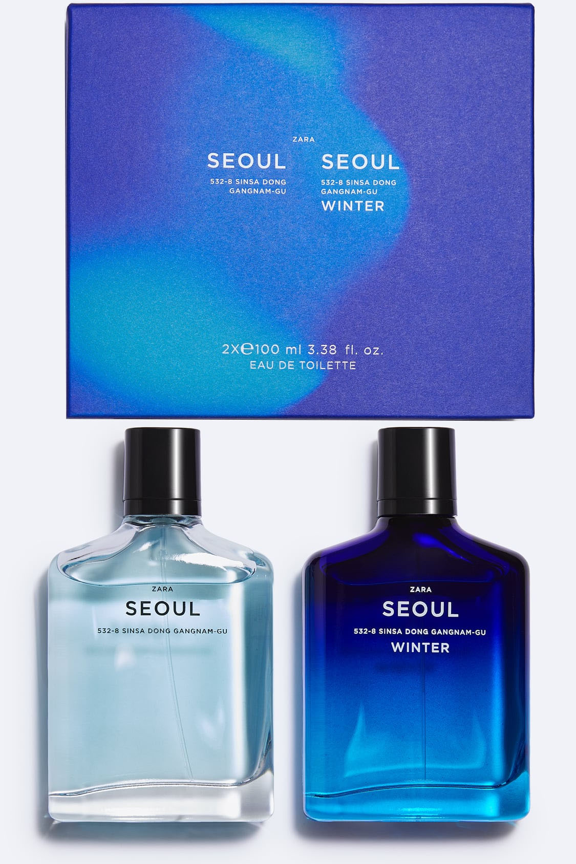 Eau de toilette dúo set. La pirámide olfativa incluye notas de pimpienta, ylang y dry amber (I) + mandarina, manzana y flor de naranjo, acompañadas de un fondo amaderado y ambarado(II).