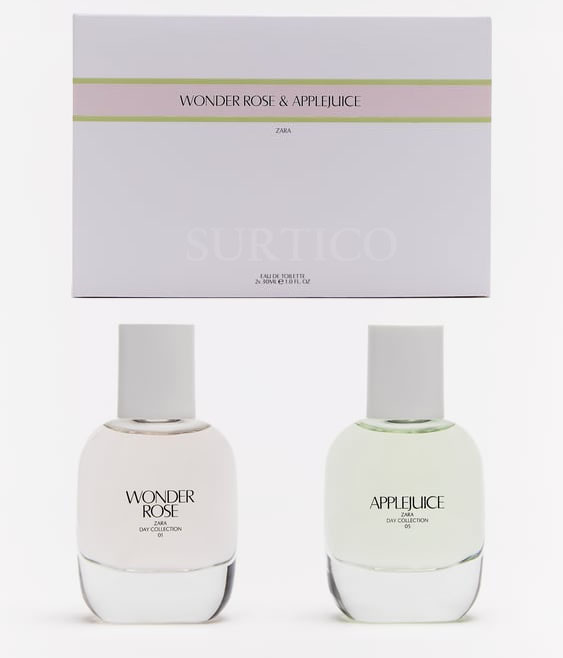 ZARA WONDER ROSE EDT 30 ML + ZARA APPLEJUICE EDT 30 ML (1.0 FL. OZ). Eau de toilette duo set. WONDER ROSE: En esta fragancia se percibe toda la fantasía de un cóctel afrutado formado por el melocotón, unas notas frutales rojas y un acorde tutti frutti, que le da una atracción luminosa especial. La flor de jazmín sambac se envuelve en la cremosidad de una nota coco-vainilla garantizando un poder adictivo infinito. Una fragancia diseñada para una chica coqueta y divertida, a la que le gusta reflejar su personalidad a través del perfume que usa. APPLEJUICE: desvela un perfume floral frutal, una fragancia viva y voluptuosa. Las notas chispeantes de manzana, naranja y pomelo rosa revelan una salida fresca vibrante. En el corazón resaltan la sensualidad y feminidad de un bouquet floral natural (rosa, jazmín, violeta y peonía). Las facetas amaderadas almizcladas del cedro y del sándalo realzan la silueta moderna de la composición y aportan un toque envolvente.