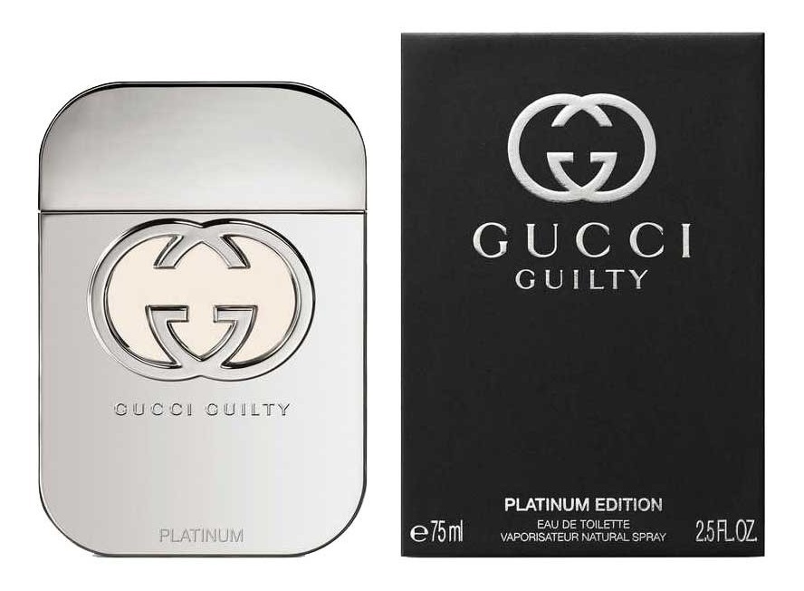 Gucci Guilty Platinum Edition fragancia de la familia olfativa oriental floral lanzada en 2016. Notas de salida: geranio y pimienta rosa. Notas de corazón: lila y durazno. Notas de fondo: ámbar y pachulí