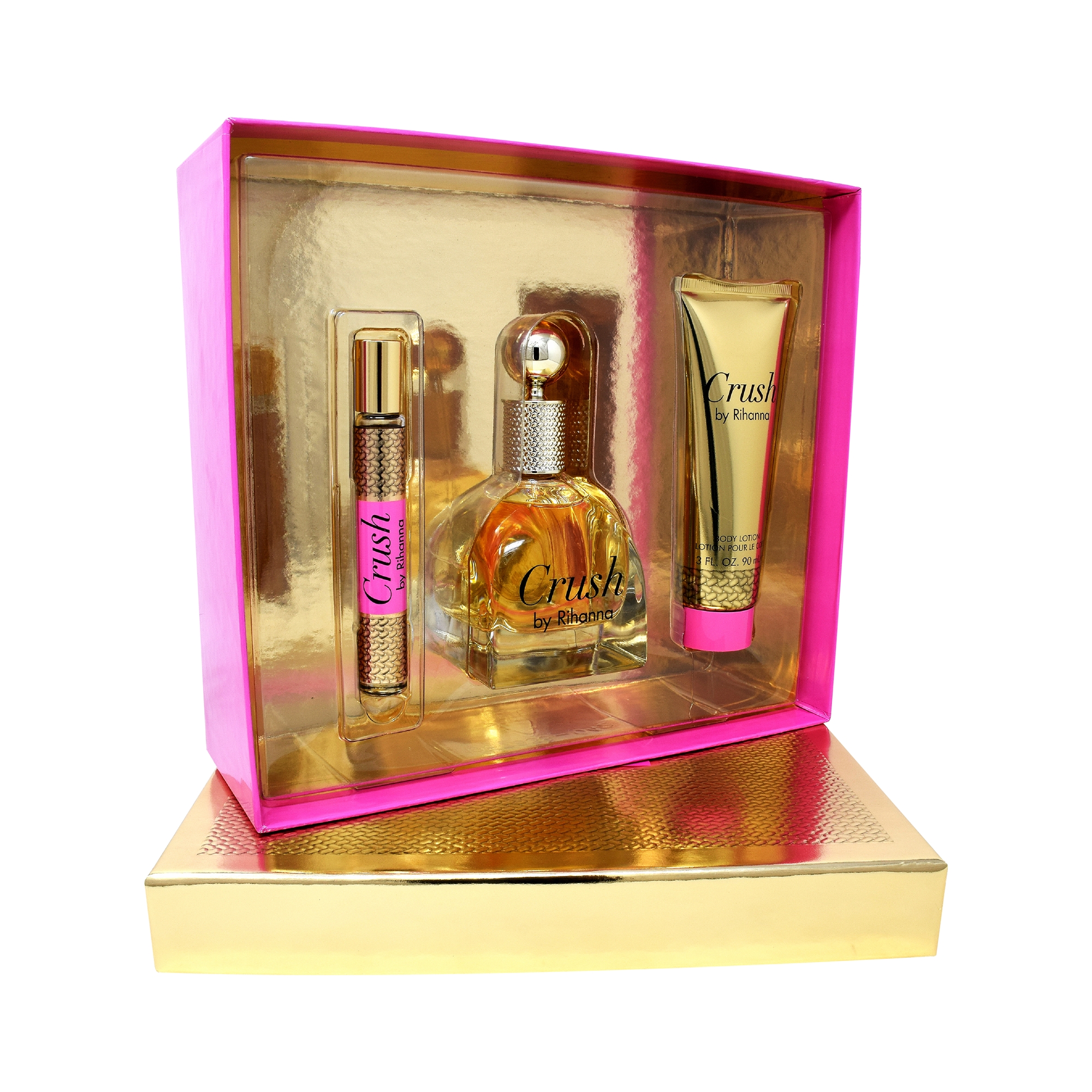 SET RIHANNA CRUSH 3PZS INCLUYE: 100ML EDP SPRAY BODY LOTION 90ML 6ML EDP SPRAY Crush de Rihanna es una fragancia de la familia olfativa Oriental Floral para Mujeres. Crush se lanzó en 2016. La Nariz detrás de esta fragrancia es Natasha Cote. Las Notas de Salida son bergamota, mandarina y pimienta rosa; las Notas de Corazón son ylang-ylang, bayas rojas y rosa rosada; las Notas de Fondo son almizcle, pachulí y cedro.